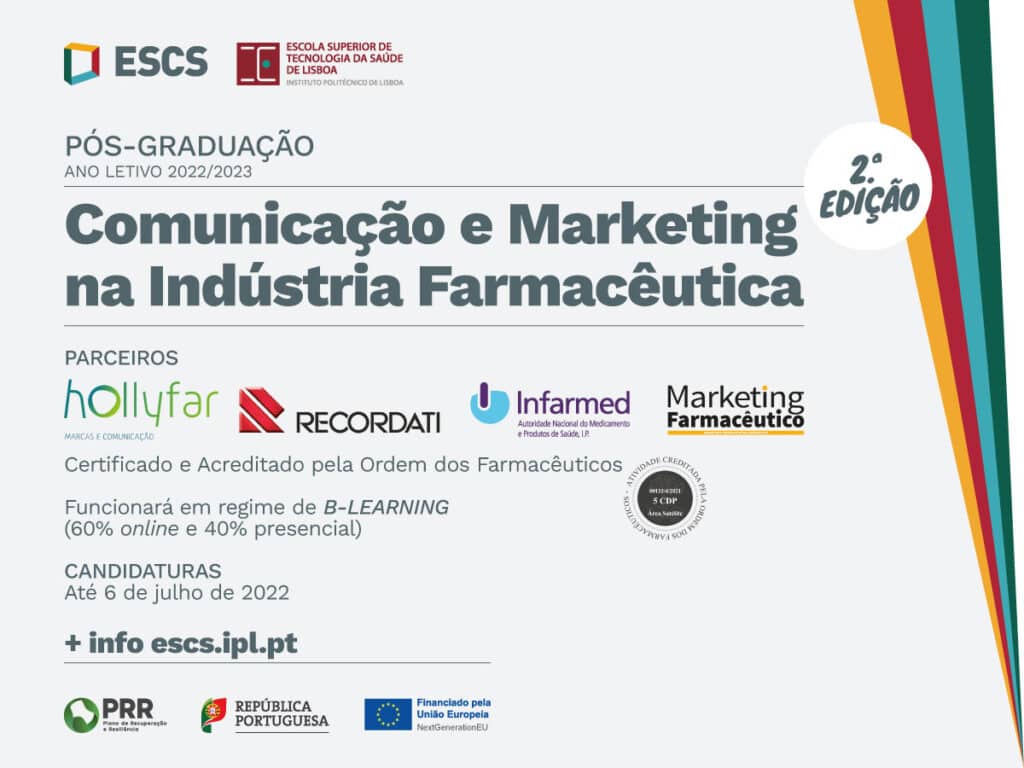 Estão a decorrer as candidaturas para a 2ª Edição do curso de pós-graduação em Comunicação e Marketing na Indústria Farmacêutica da Escola Superior de Comunicação Social (ESCS) e Escola Superior de Tecnologia da Saúde de Lisboa (ESTeSL), unidades orgânicas do Instituto Politécnico de Lisboa. Este curso é feito em parceria com a revista MARKETING FARMACÊUTICO (Hollyfar – Marcas e Comunicação) e conta com o apoio da multinacional farmacêutica Jaba Recordati e do Infarmed.