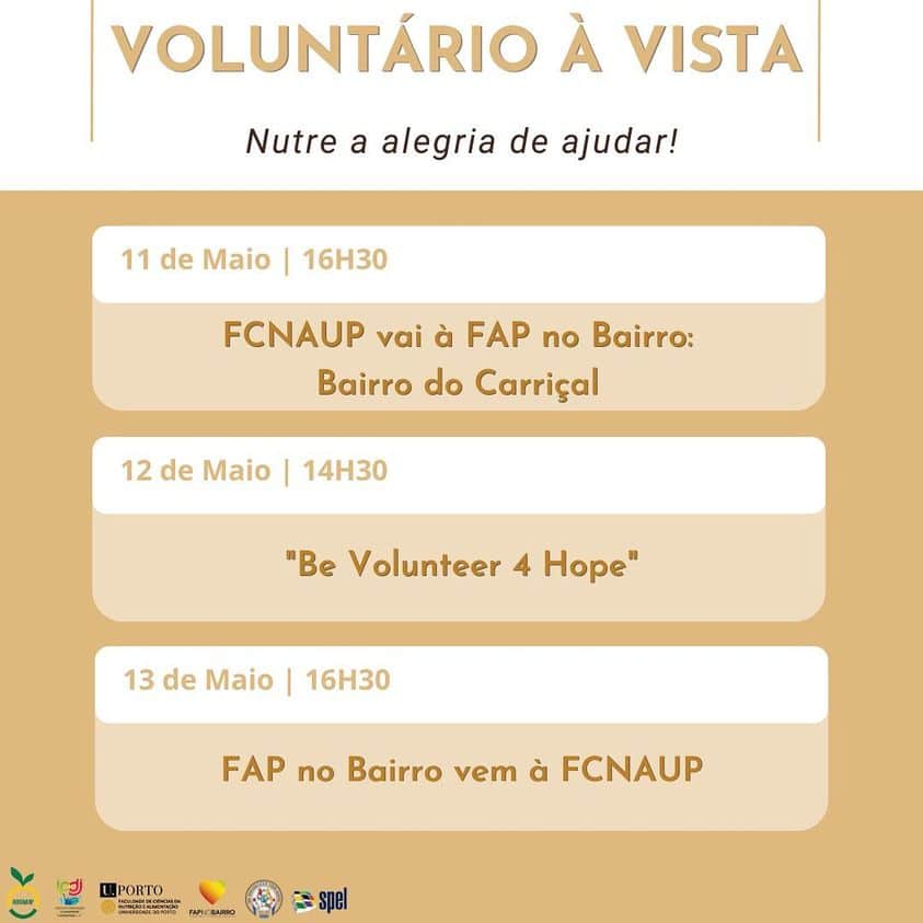 A Associação de Estudantes da Faculdade de Ciências da Nutrição e Alimentação da Universidade do Porto (AE FCNA UP) promove, nos próximos dias 11,12 e 13 de Maio, a 2ª Edição do “Voluntário à vista!”.