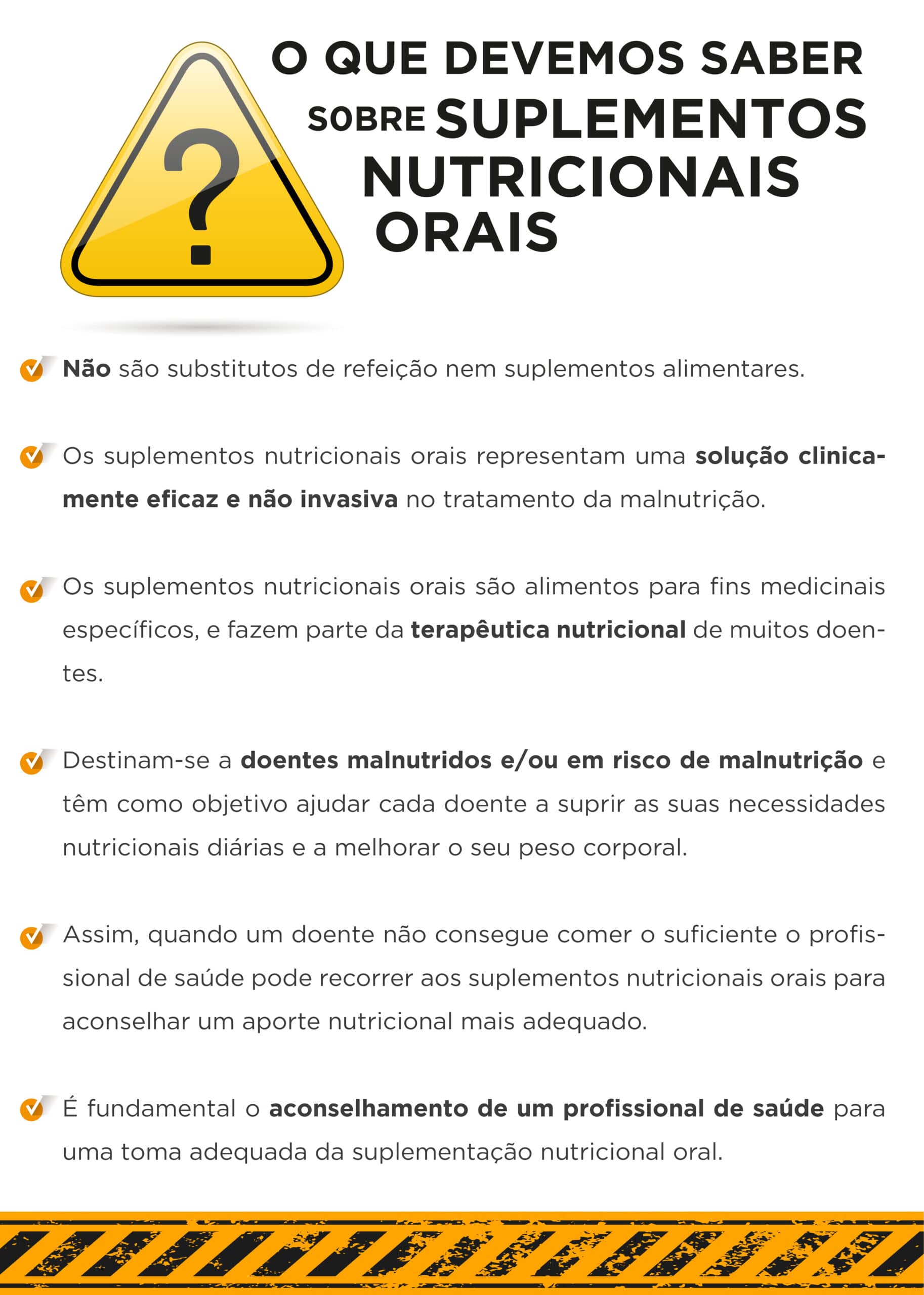 Os suplementos nutricionais orais são constituídos por macronutrientes (proteínas, hidratos de carbono, fibra, lípidos), micronutrientes (minerais e vitaminas) e água, e a sua composição é desenvolvida e adaptada para satisfazer as necessidades nutricionais de doentes que necessitam de realizar terapêutica nutricional.