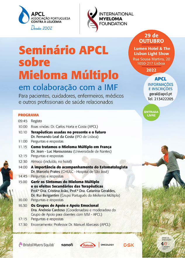 A Associação Portuguesa Contra a Leucemia (APCL), em colaboração com a International Myeloma Foundation (IMF), vai realizar no dia 29 de outubro, entre as 10h00 e as 17h30, no Lumen Hotel & The Lisbon Light Show, o um seminário totalmente dedicado ao Mieloma Múltiplo. Dirigido a doentes, cuidadores e profissionais de saúde, o evento vai ter o contributo de vários especialistas para esclarecer várias temáticas ligadas à doença. A participação neste evento, exclusivamente presencial, é gratuita, mas requer inscrição prévia.