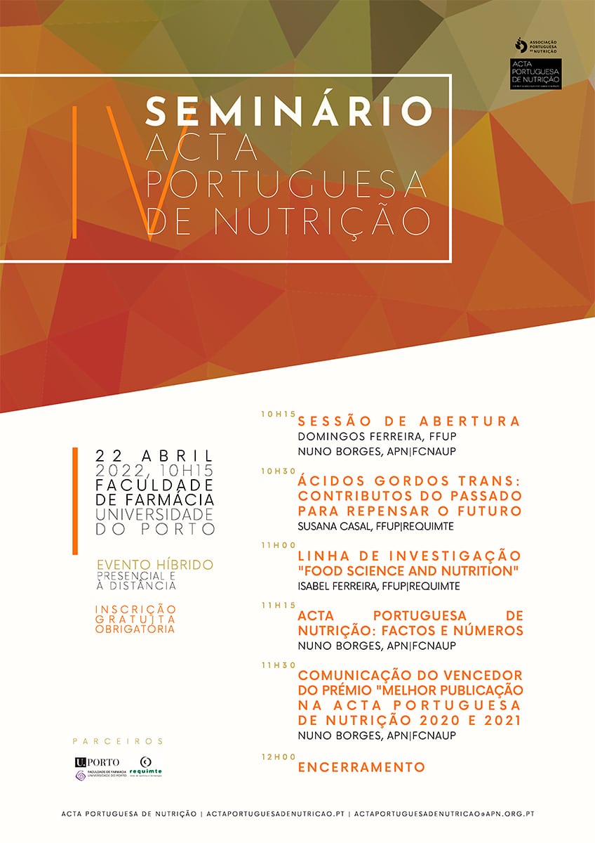 A Associação Portuguesa de Nutrição (APN) realiza, no próximo dia 22 de abril, a 4ª edição do Seminário da Acta Portuguesa de Nutrição.