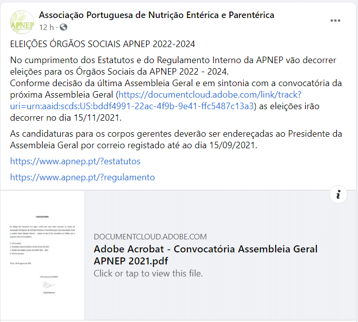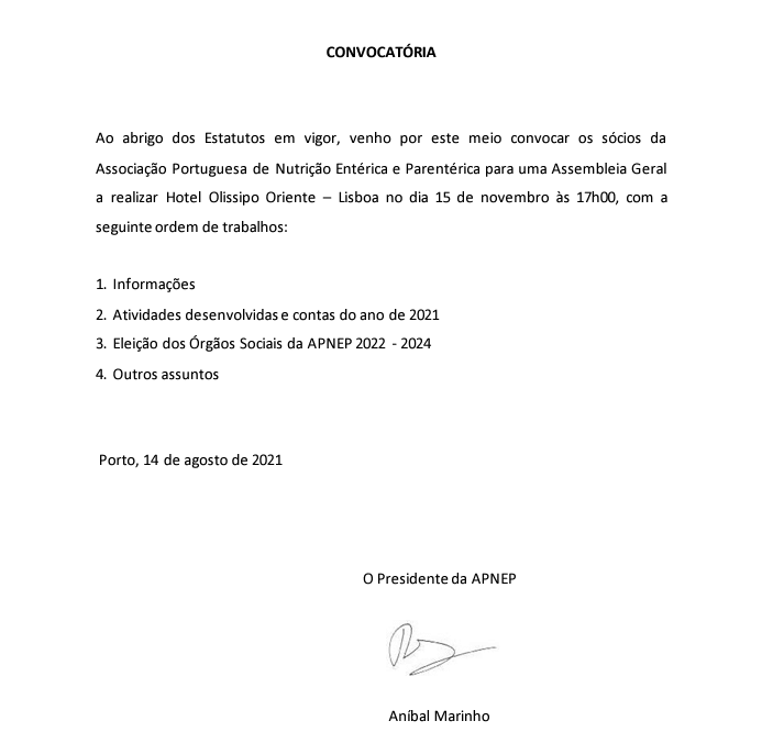A Associação Portuguesa de Nutrição Entérica e Parentérica (APNEP) anunciou que irão decorrer as eleições aos Órgãos Sociais da Associação, para o biénio 2022-2024.