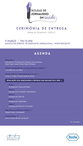 O anúncio dos jornalistas e projetos vencedores da edição de 2020 das Bolsas de Jornalismo em Saúde promovidas pelo Sindicato de Jornalistas, com o apoio da Roche, será feito no dia 9 de março pelas 11 horas, através de uma cerimónia digital que pode ser seguida na página do Facebook do Sindicato dos Jornalistas ou através do site da Roche.