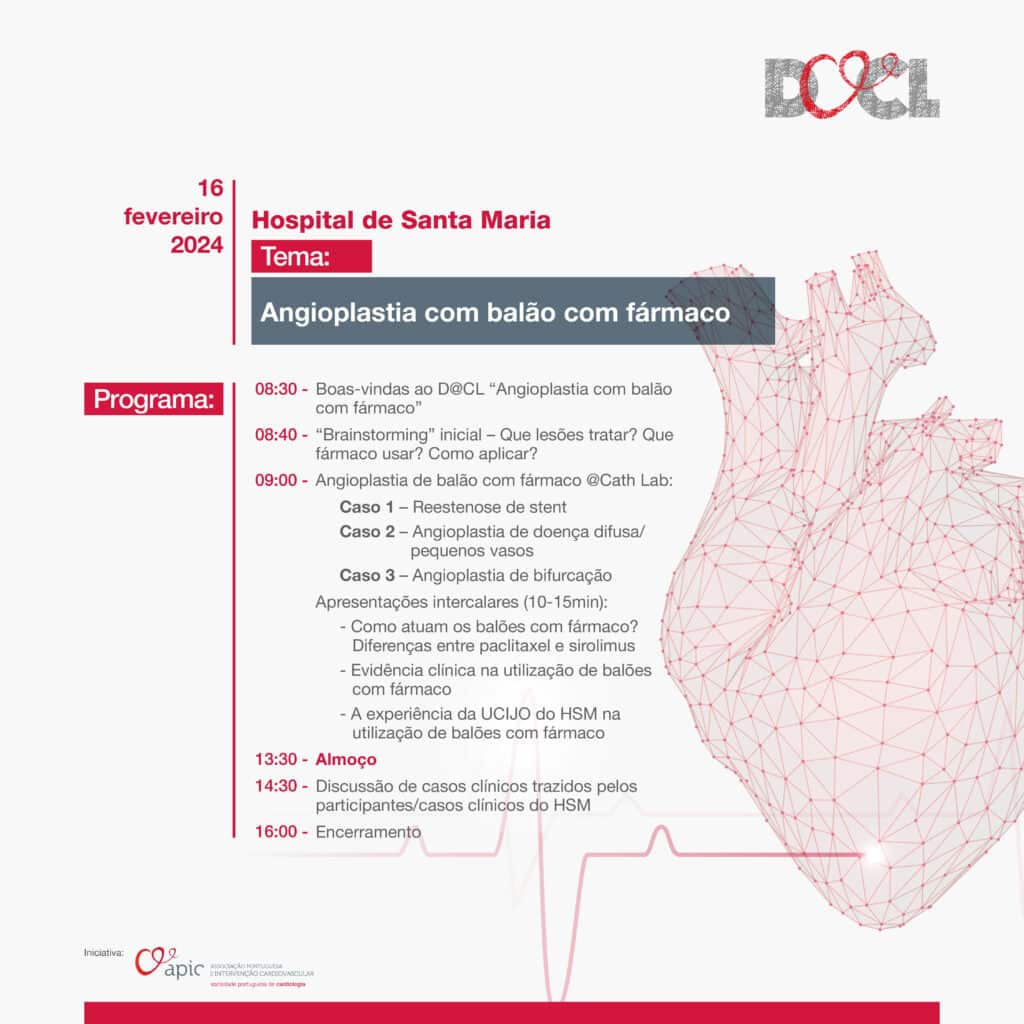 A Associação Portuguesa de Intervenção Cardiovascular (APIC) está a promover a iniciativa formativa Day at the Cath Lab (D@CL), que realizar-se-á no próximo dia 16 de fevereiro, na Unidade Local de Saúde de Santa Maria (Hospital de Santa Maria), subordinada ao tema “Angioplastia com balão com fármaco”. Esta ação tem como principais objetivos debater e consolidar conhecimentos sobre o tratamento através de angioplastia com balão com fármaco na prática clínica.