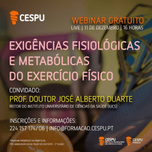 No próximo dia 11 de dezembro, pelas 16:00, o CESPU Formação organiza o “Webinar “Exigências Fisiológicas e Metabólicas do Exercício Físico”.