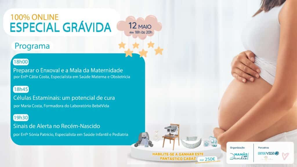 Se aguarda a chegada do seu bebé e está a tratar dos últimos preparativos, a próxima sessão do “Especial Grávida”, que se realiza dia 12 de maio às 18h00, é para si! A Academia Mamãs Sem Dúvidas vai promover uma nova sessão online destinada às futuras mamãs com o objetivo de esclarecer alguns tópicos, tais como o enxoval e a mala de maternidade, com a ajuda de especialistas. A inscrição é gratuita e pode ser feita aqui: https://mamassemduvidas.pt/campanha/.