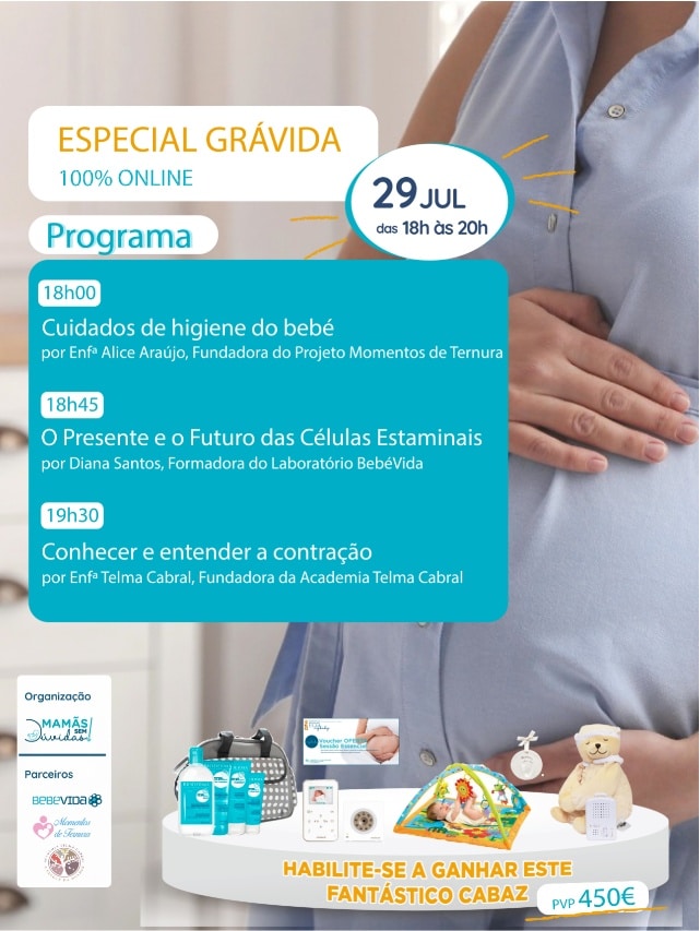 A Academia Mamãs sem Dúvidas irá realizar no dia 29 de julho, entre as 18h e as 20h, uma nova edição do “Especial Grávida” 100% online destinada a gestantes. Esta iniciativa procura esclarecer questões práticas inerentes à maternidade, em que vários especialistas vão debruçar-se sobre temas como as contrações que antecedem o parto e os cuidados de higiene do bebé.