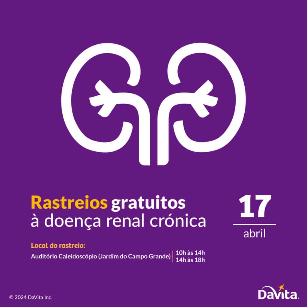 A DaVita Portugal, em parceria com a Câmara Municipal de Lisboa, vai promover uma iniciativa de rastreio à doença renal, no dia 17 de abril de 2024, no Auditório Caleidoscópio, no Jardim do Campo Grande, das 10h às 18h, no âmbito da Semana da Saúde organizada pela Faculdade de Psicologia da Universidade de Lisboa. A participação na iniciativa é gratuita e destina-se a toda a população, em especial aos jovens.