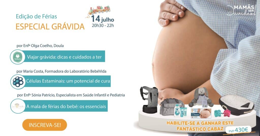 Se está grávida e quase a ir de férias não pode perder a próxima edição do “Especial Grávida” da Mamãs Sem Dúvidas. A sessão online vai realizar-se no dia 14 de julho às 20h30, em formato virtual, sendo especialmente dedicada a temas relacionados com o período de férias. A sessão é gratuita e as inscrições podem ser feitas no site da Mamãs Sem Dúvidas.