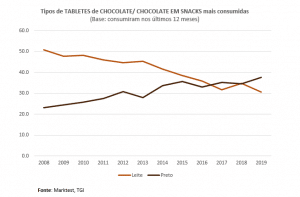 Tendo em conta o período entre 2008 e 2019, observa-se que a tendência é para a diminuição do número de consumidores de chocolate de leite. Já o consumo de chocolate preto tem vindo a aumentar.