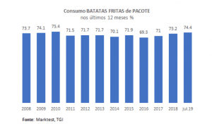 Isto significa que 6,4 milhões de portugueses consumiram batatas fritas de pacote nos últimos 12 meses, o que representa 74.4% dos residentes no Continente com 15 e mais anos.