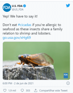 À medida que os insetos começam a ser utilizados na alimentação, a Food and Drug Administration (FDA), a agência reguladora do medicamento dos Estados Unidos, aproveitou para alertar que as cigarras são parentes dos crustáceos, e como tal devem ser evitadas pelas pessoas que são alérgicas a frutos do mar.