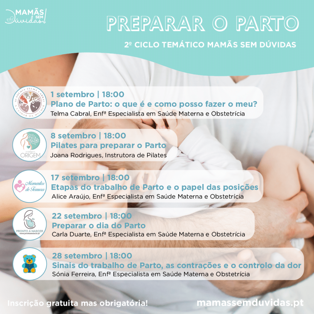 • 22 de setembro: Preparar o dia do parto – com Carla Durante, Enfermeira especialista em saúde materna e obstetrícia;