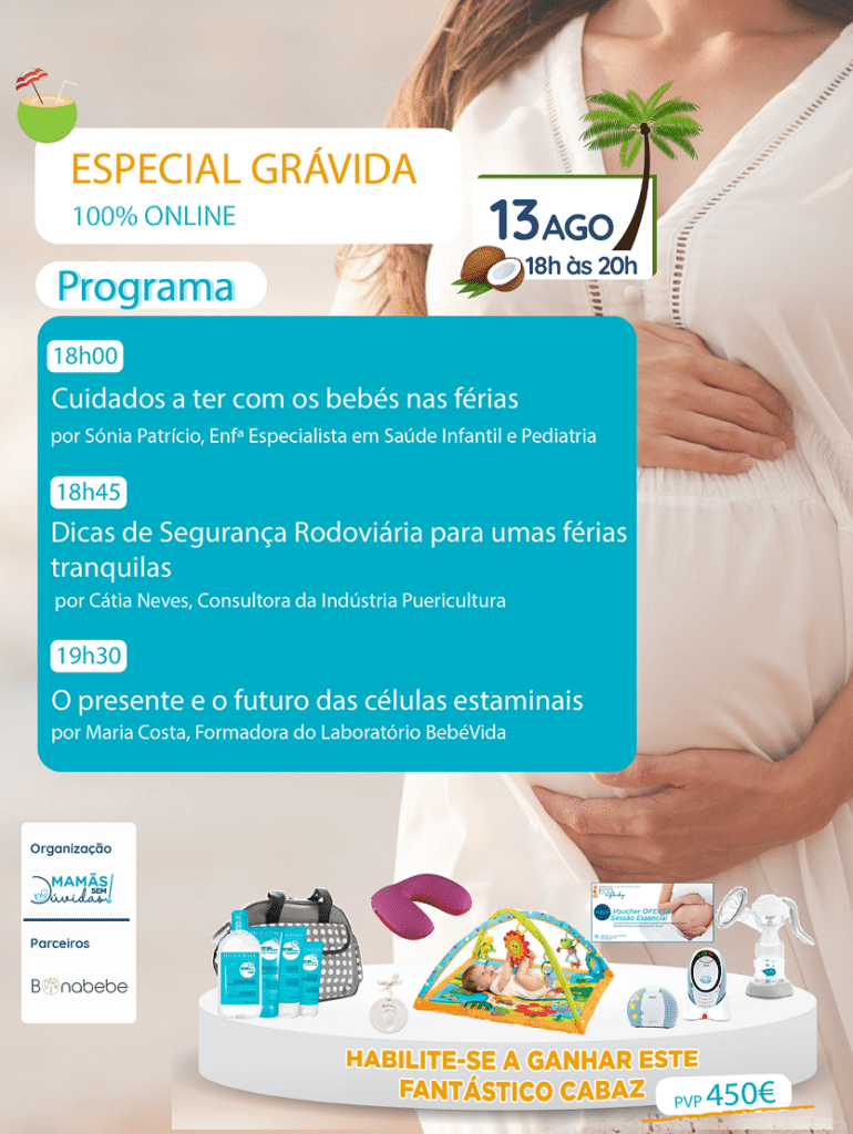 • “Cuidados a ter com os bebés nas férias”, com a intervenção de Sónia Patrício, enfermeira especialista em saúde materna e obstetrícia, que vai partilhar com as gestantes recomendações a ter em conta na hora de ir de férias;