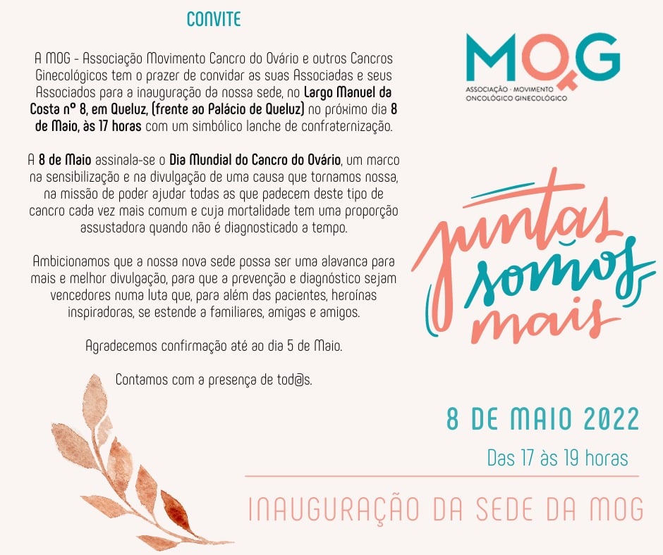 A Associação Movimento Cancro do Ovário e outros Cancros Ginecológicos – MOG – a propósito da celebração do Dia Mundial do Cancro do Ovário, que se celebra a 8 de maio, inaugura neste dia a sua sede em Queluz com um evento dirigido a todos os associados. Com a inauguração deste espaço, a associação espera conseguir continuar a apoiar mais doentes de cancro do ovário e de outros cancros ginecológicos, dando assim continuidade à sua missão desde a data da sua fundação em dezembro de 2019.