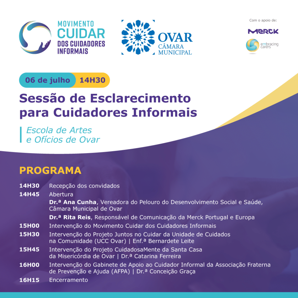 No próximo dia 6 de julho, pelas 14h30, Ovar recebe a terceira de inúmeras Sessões de Esclarecimento que o Movimento Cuidar dos Cuidadores Informais está a organizar por todo o País, durante este ano, com o apoio da Rede de Autarquias que Cuidam dos Cuidadores Informais (RACCI), da qual a Câmara Municipal de Ovar faz parte desde 2021.