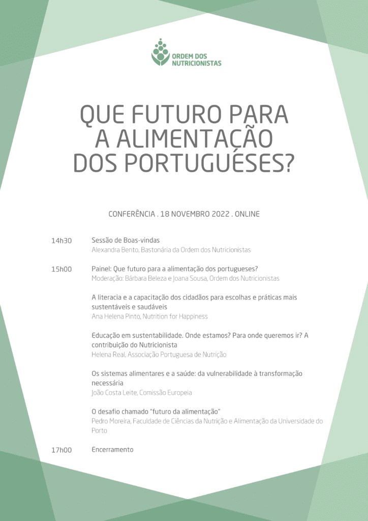 A conferência vai contar com a presença de Alexandra Bento, na sessão de boas-vindas e com a moderação de Bárbara Beleza e Joana Sousa, da ON. Como oradores, o painel vai contar com Ana Helena Pinto da Nutrition for Happiness, Helena Real da Associação Portuguesa de Nutrição, João Costa Ferreira da Comissão Europeia e Pedro Moreira da Faculdade de Ciências da Nutrição e Alimentação da Universidade do Porto.