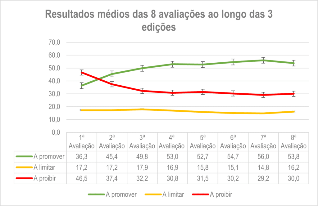 Ao longo das três edições verificou-se uma melhoria no consumo dos alimentos da categoria “a promover” em cerca de 17.5 pontos percentuais e uma redução do consumo dos alimentos “a limitar” em cerca de 16,5 pontos percentuais, como se pode constatar no gráfico abaixo que compila os resultados médios das três edições do projeto, nos oito momentos de avaliação.