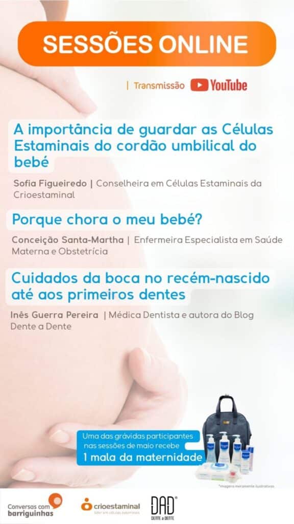No dia 15 de maio, pelas 18h00, as Conversas com Barriguinhas organizam um evento online para grávidas e recém-mamãs, que junta especialistas em Saúde Materna e Obstétrica e Saúde Oral para abordar questões fundamentais sobre a maternidade e os cuidados ao bebé.
