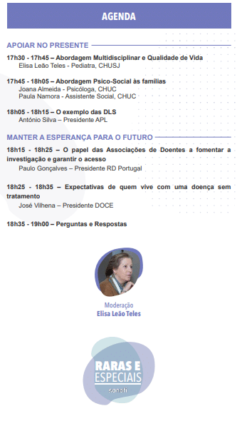 Este webinar será transmitido em direto, entre as 17:30 e as 19:00, a partir do Facebook de Raras e Especiais, e conta com a moderação de Elisa Leão Teles (pediatra e coordenadora do Centro de Referência de Doenças Hereditárias do Metabolismo do Centro Hospitalar e Universitário de São João).