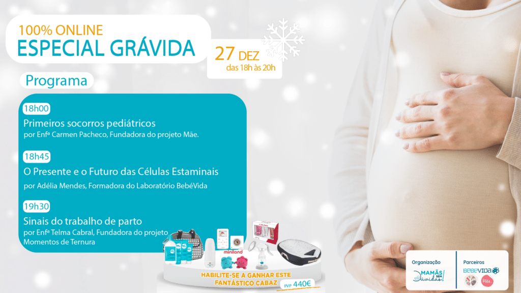 Antes de o ano terminar, a Academia Mamãs Sem Dúvidas tem preparada mais uma edição do “Especial Grávida”, que se vai realizar no dia 27 de dezembro, às 18h00, convidando vários especialistas para abordar temas relacionados com a maternidade entre os quais os primeiros socorros em idade pediátrica e os sinais do trabalho de parto. A sessão é online e totalmente gratuita.