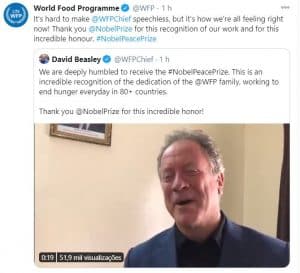 Já o diretor do PAM, o norte-americano David Beasley, que teve conhecimento da atribuição do Nobel da Paz através de um porta-voz da organização, indicou não ter palavras para reagir ao prémio.