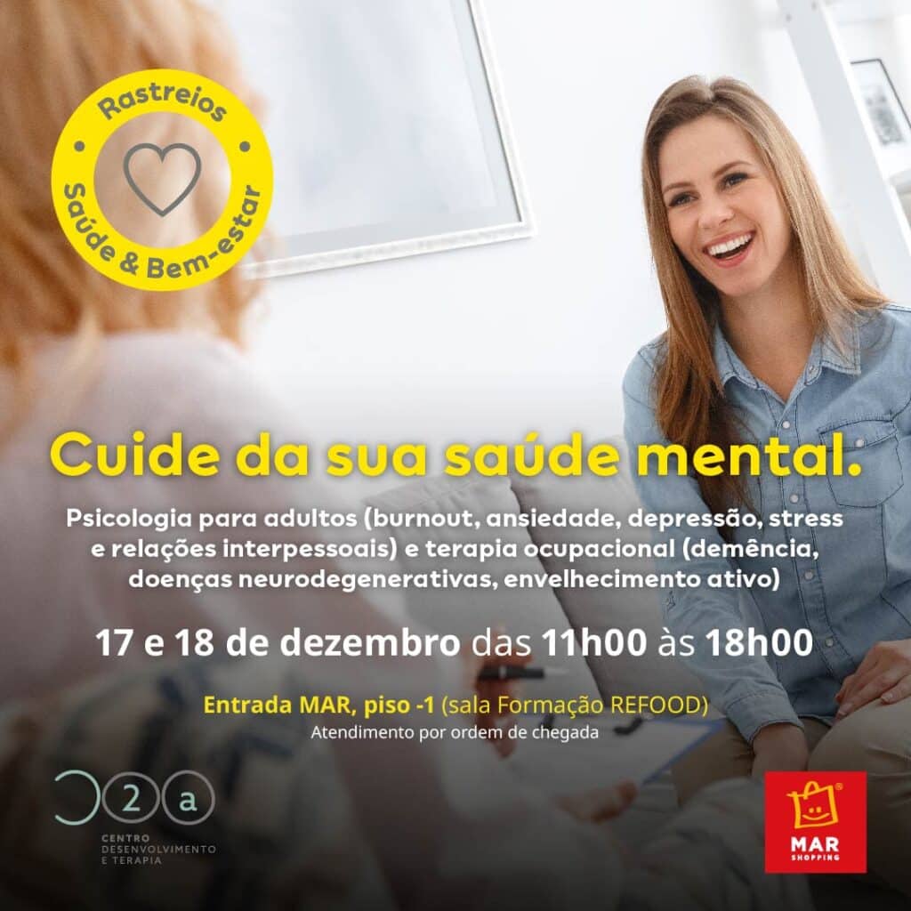 Nos dias 17 e 18 de dezembro, o MAR Shopping Matosinhos, disponibilizará ações de sensibilização tendo em vista a prevenção de doenças psicológicas como depressão, burnout ou ansiedade e terapias ocupacionais para pessoas com demência ou doenças neurodegenerativas, por exemplo. Durante mais de um ano os meeting places MAR Shopping disponibilizaram às comunidades em que estão inseridos rastreios e ações de sensibilização gratuitos, com vista à deteção precoce de indicadores de saúde que careçam de acompanhamento médico, bem como à transmissão de boas práticas em matérias de saúde e bem-estar.