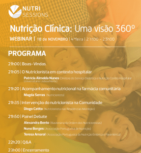 Em formato webinar e com o tema “Nutrição Clínica: Uma visão 360º”, este será um debate que pretende oferecer aos participantes, uma perspetiva global da intervenção dos Nutricionistas na manutenção, melhoria e recuperação do estado de saúde dos portugueses, partindo das diversas áreas de atuação destes profissionais de Saúde.