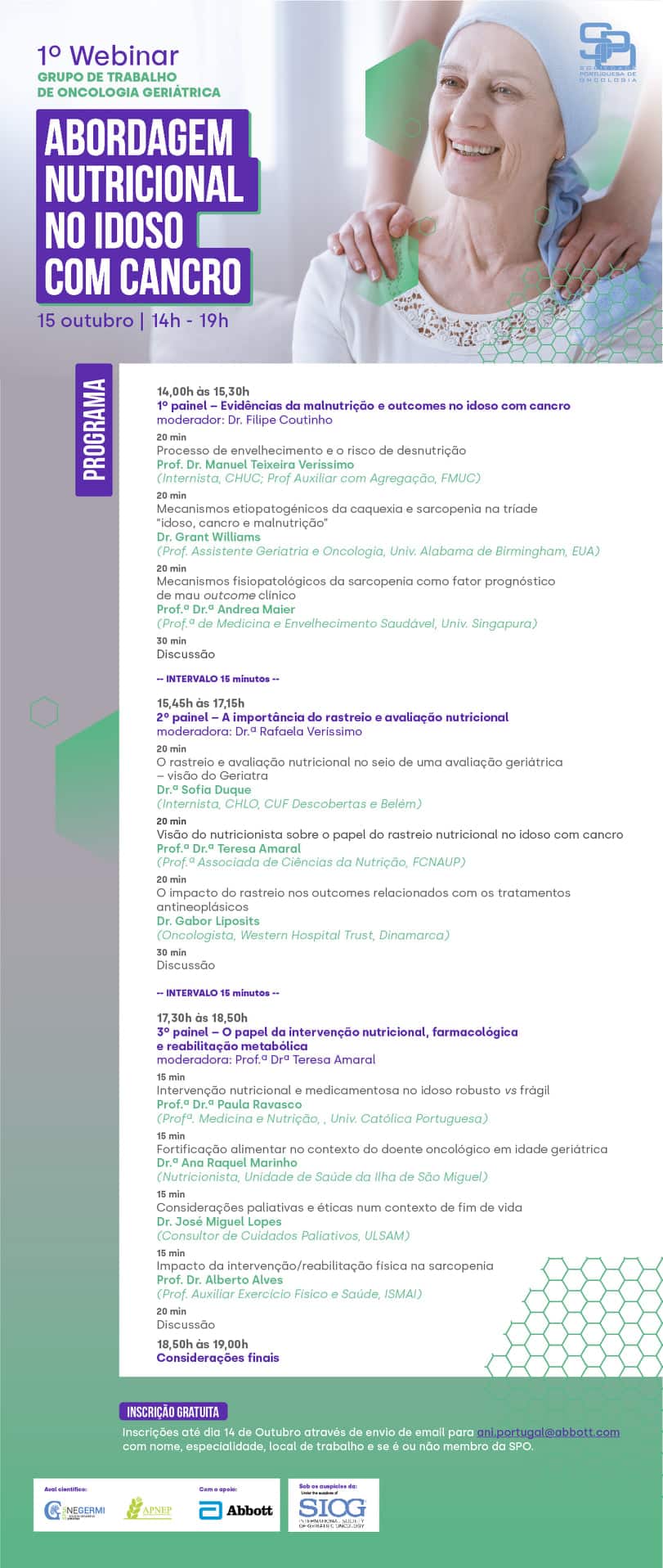 O webinar conta com o apoio da Sociedade Internacional de Oncologia Geriátrica (SIOG), da Associação Portuguesa de Nutrição Entérica e Parentérica (APNEP) e do Núcleo de Estudos de Geriatria da Sociedade Portuguesa de Medicina Interna (NEGERMI/SPMI).