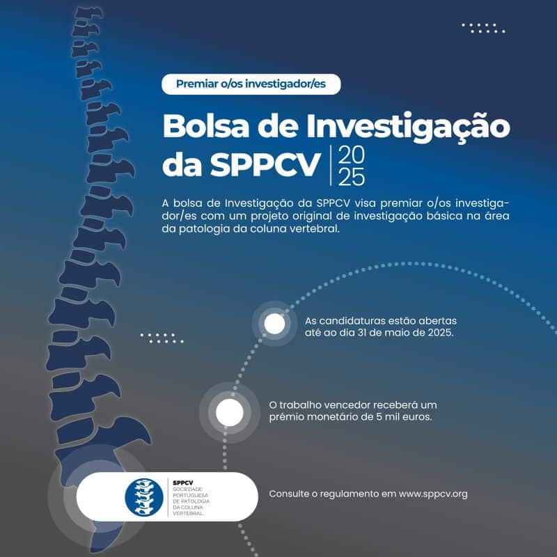 A Sociedade Portuguesa de Patologia da Coluna Vertebral (SPPCV) anuncia que estão abertas as candidaturas para a Bolsa de Investigação na área da patologia da coluna vertebral, decorrendo entre 1 de março e 31 de maio de 2025. O projeto vencedor receberá um prémio no valor de cinco mil euros.