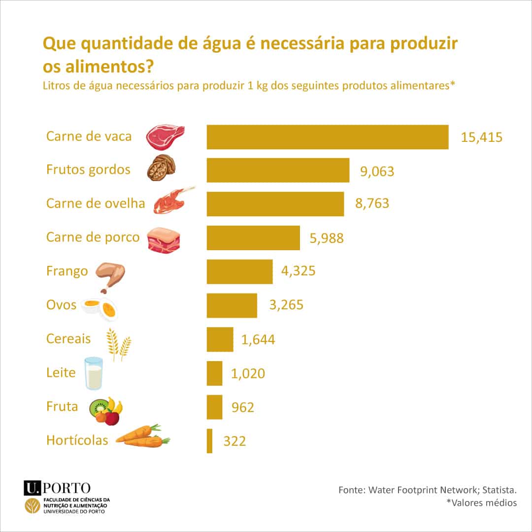 Depois da carne de vaca, o destaque vai para os frutos secos: para 1 quilo são necessários 9.063 litros de água. Para a mesma quantidade alimentar, seguem-se a carne de ovelha (8.763 litros), carne de porco (5.988 litros), frango (4.325), ovos (3.265 litros), cereais (1.644), leite (1.020), fruta (962) e hortícolas (322). Veja o gráfico: