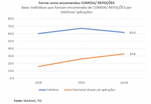 No inquérito realizado em julho de 2020, foram 2 365 mil o número de indivíduos que referiram ter encomendado comida/refeições pelo telefone ou aplicações nos últimos 12 meses, o que representa 27,6% dos residentes no Continente, com 15 e mais anos.